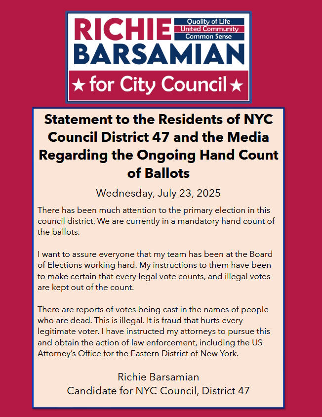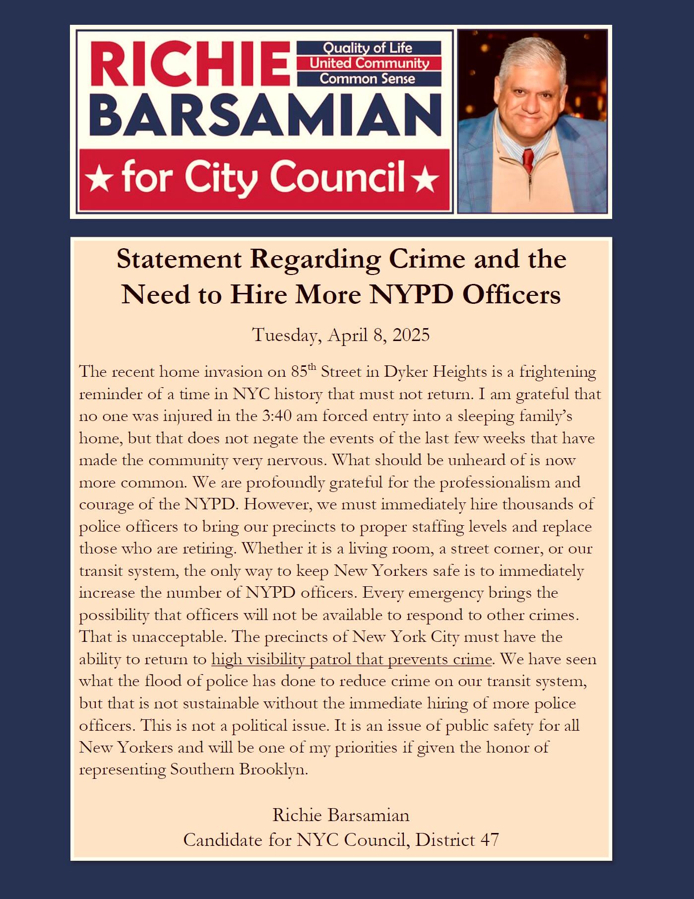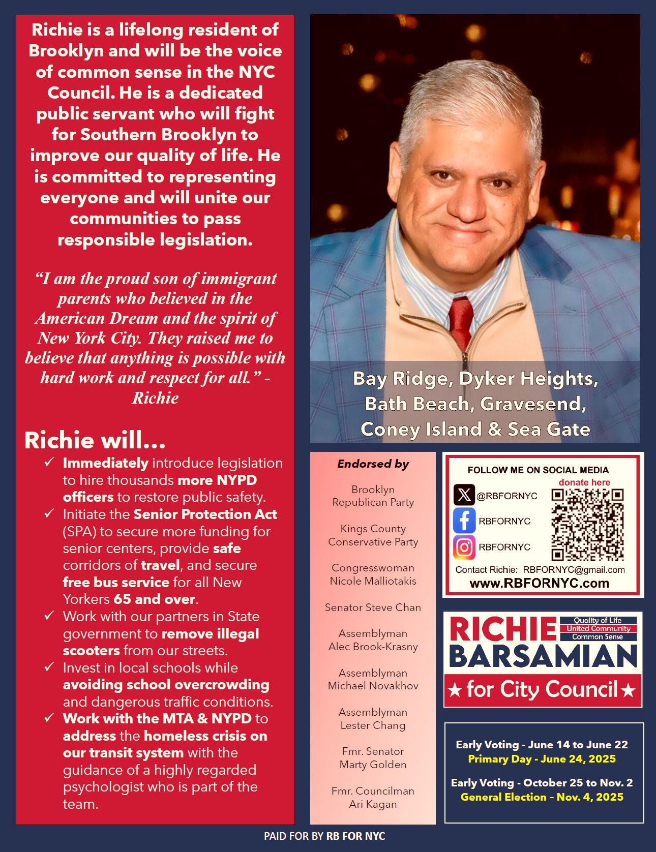 Please support Richie Barsamian by contributing to his campaign RB FOR NYC for the 2025 City Council District 47 race.